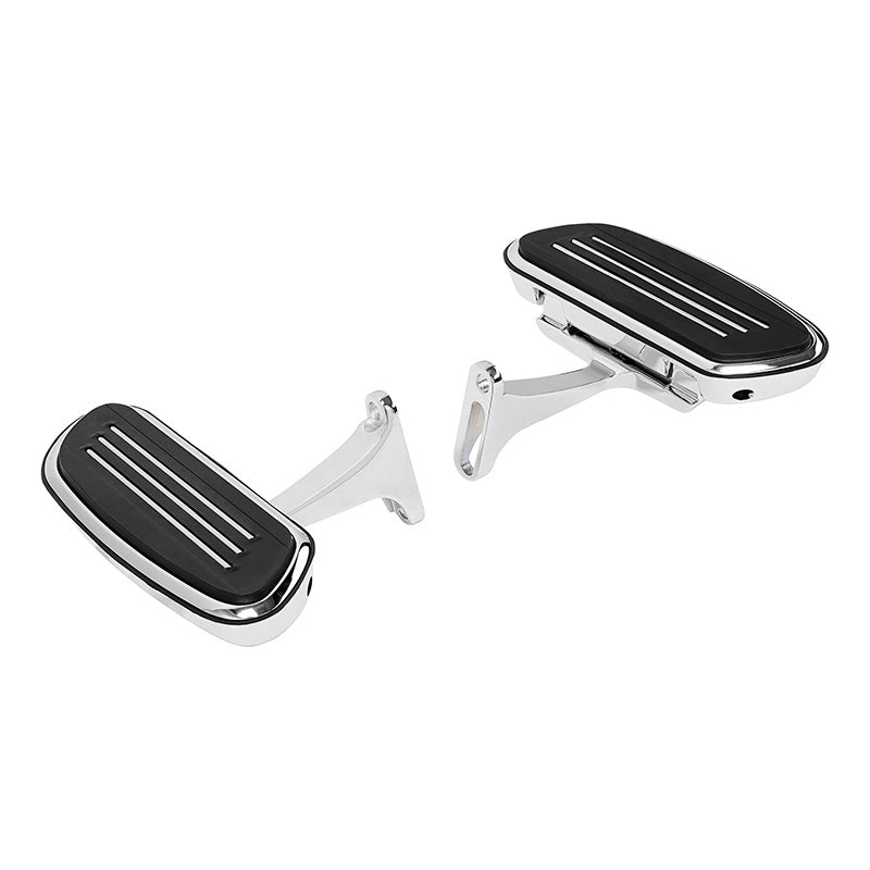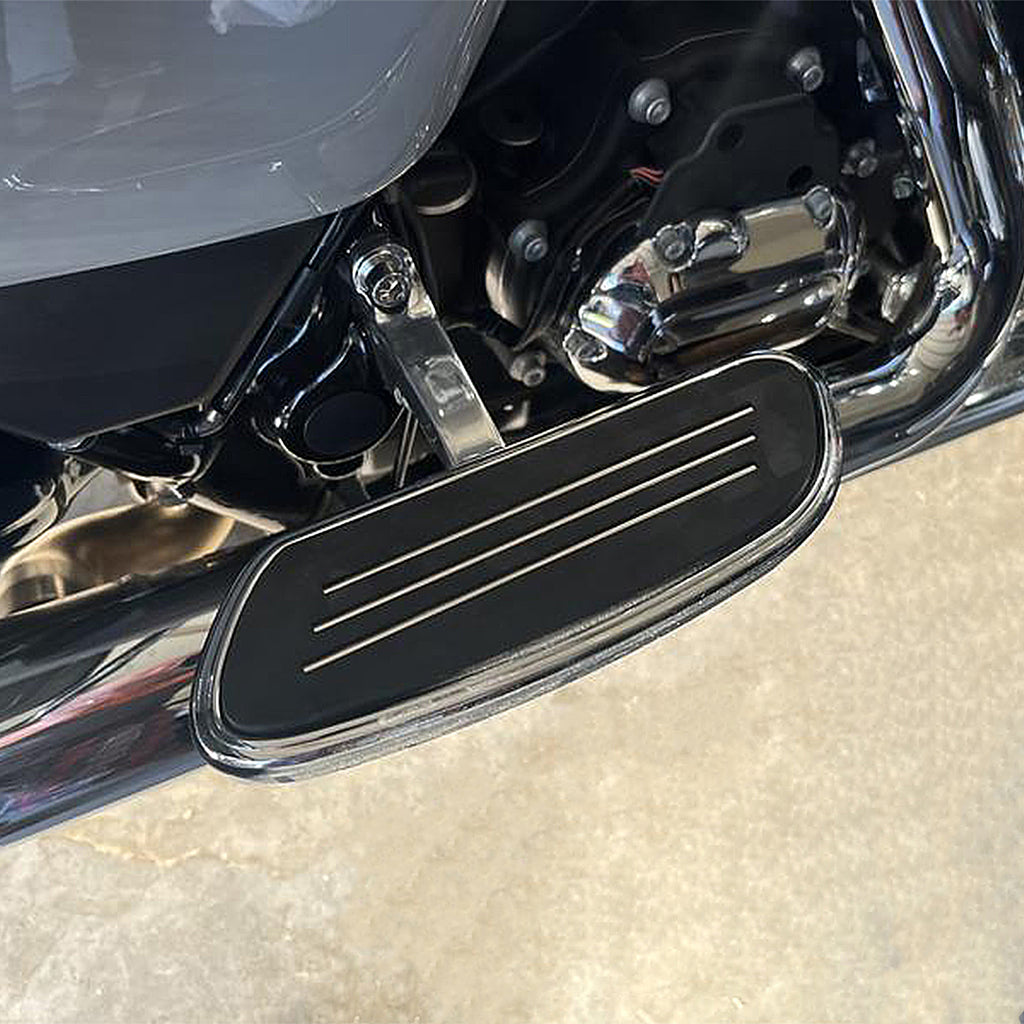 Two-piece construction(Pan & Insert). Add a custom look of these Street Glide style footboards to your touring model Harley-Davidson. Color: Black/Chrome Collection: Streamliner Position: Passenger Material: Aluminum Footboards, Rubber Pads